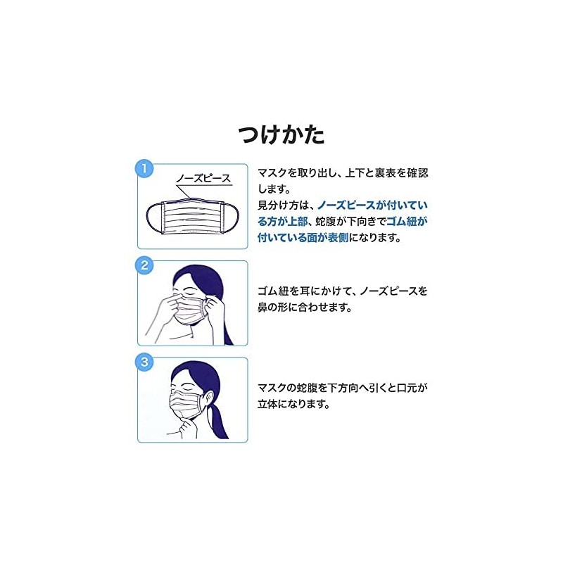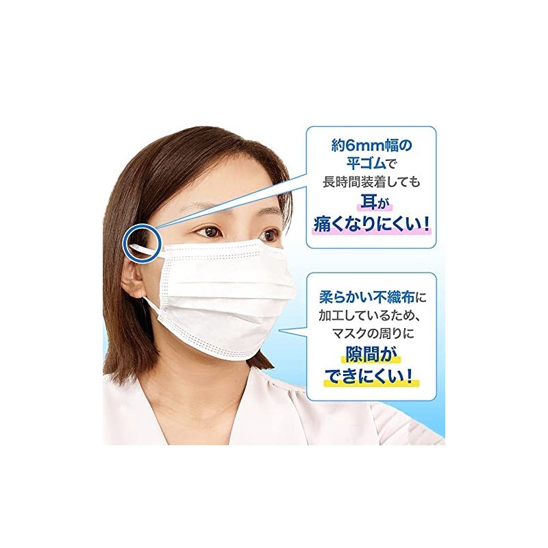 - 耳にやさしい約6mm幅の平ゴムを採用。長時間装着しても耳が痛くなりにくい構造です。柔らかい不織布に加工している為、マスク周りの隙間を抑制