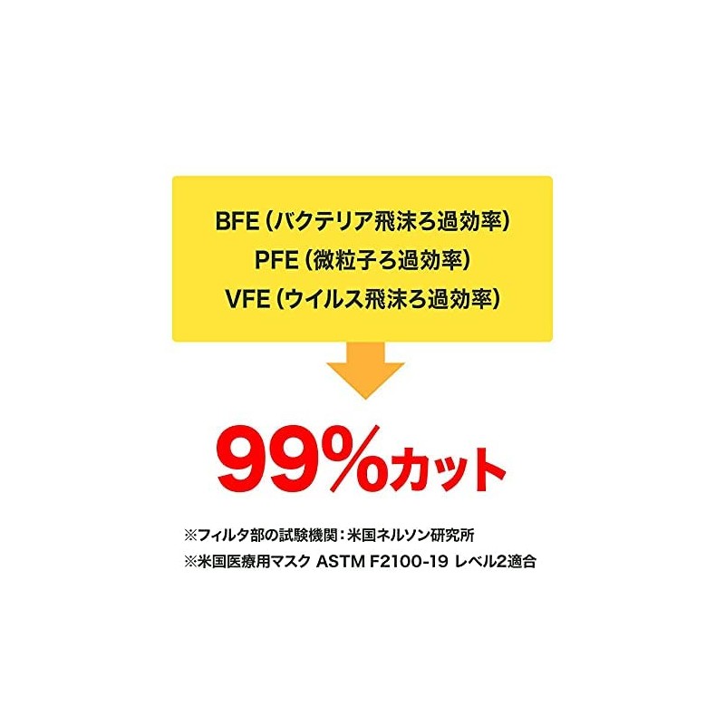 - 米国医療用マスク ASTM F2100-19 レベル2適合マスク、BFE、PFE、VFEの捕集(ろ過)効率 99%カット、 (米国研究所による試験実施) VFE BFE PFE 99%カット