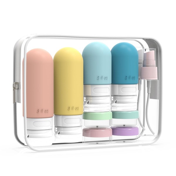 - Multi-functional Travel Accessories: The set includes 3oz travel bottle*2, 2oz travel bottle*2, 0.35oz travel canister*4, 30ml spray bottle, digging spoon*2, funnel*1, cleaning brush*1, sorting label sticker*1, zipper transparent travel PVE bag*1. This allows you to carry different beauty products and cosmetics as needed.