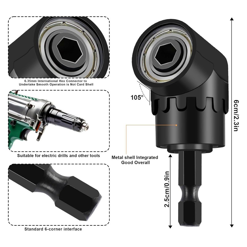 - 105° Right Angle Drill Attachment: The drill set includes 2 pieces of 105 ° Right Angle Drill Accessories (long and short) made of high-quality steel material, which can be quickly replaced and rust resistant. Use in which you use when you have hard places to get to, can to connect a drill, rechargeable drill or manual wrench to extend it to inaccessible narrow places for flexible installation work. Universal socket wrench can automatically adjust to any size or shape, suitable for standard 1/4 to 3/4 inches or metric 7mm to 19mm nuts, screws and bolts, suitable for most general maintenance. Compact and portable to anywhere you want.