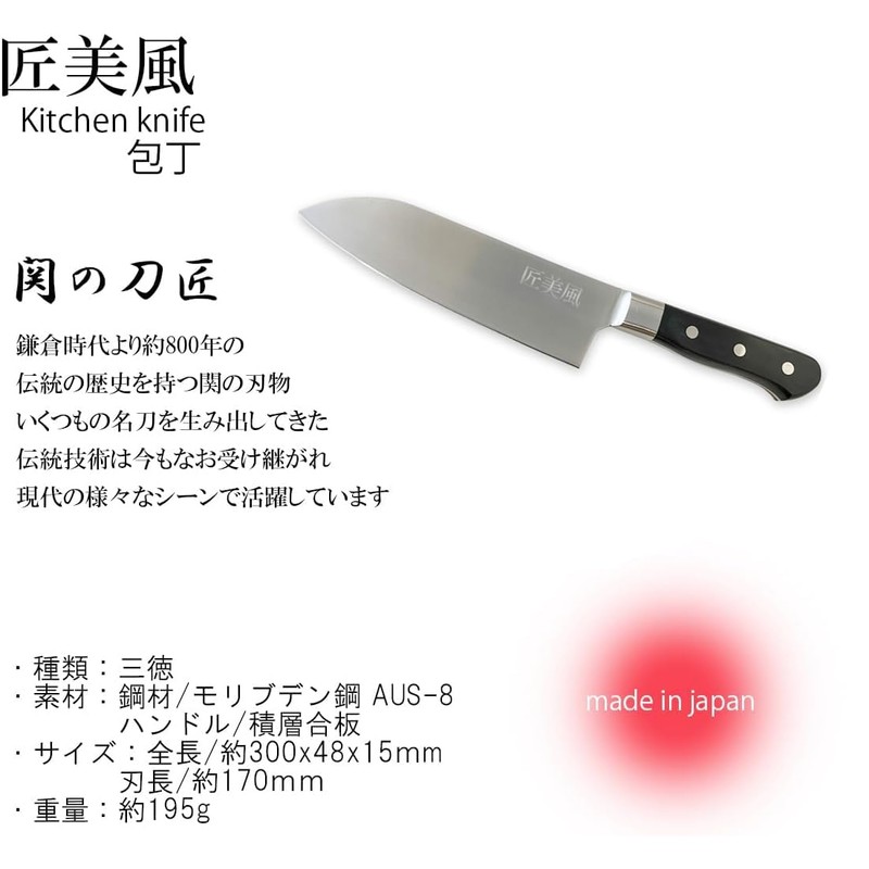 - ・種類:三徳 ・全長:約300x48x15mm ・刃渡り:約 170mm 商品重量:約195g・素材:モリブデン鋼 AUS-8・ハンドル:積層合板