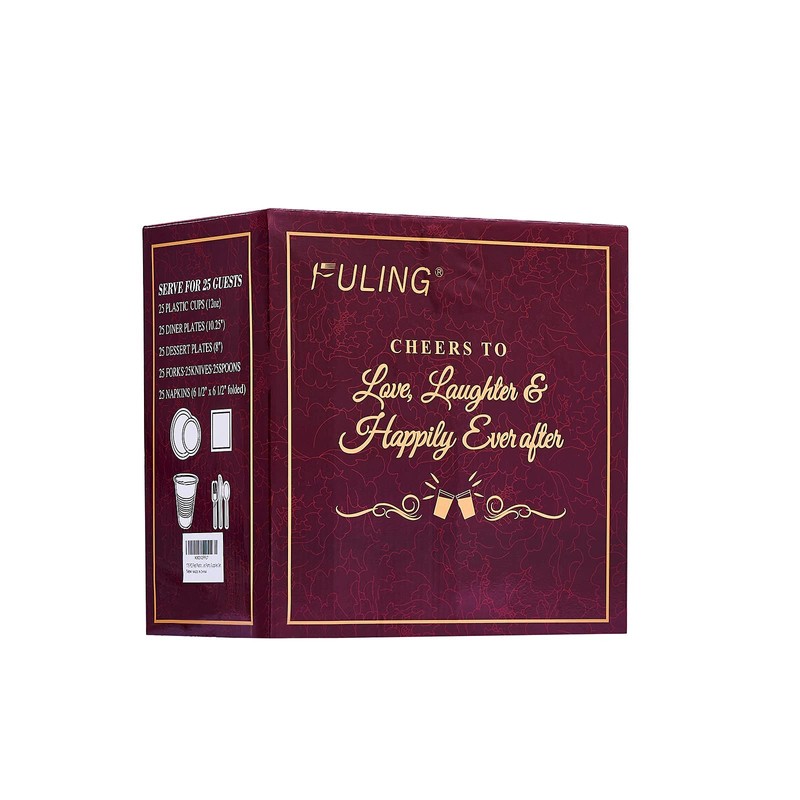 - KIT FOR 25 GUESTS - This fancy plastic party dinnerware set comes with 25 pieces of 10.25" dinner plates, 25 pieces of 8" dessert plates, 25 pieces of 12 oz cups and 25 13" beverage napkins (2-ply and measuring 6.5" x 6.5"), 25 sets of heavy duty red plastic utensils (25 forks, 25 spoons, 25 knives).