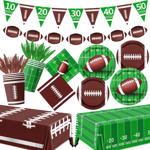 - 【FOOTBALL】You will get 178pcs football theme party supplies,1piece banner,2piece tablecloth,25pcs 9"plates,25pcs 7"plates,26pcs 9oz cups,25pcs knives,25pcs forks and 50pcs napkins.We match the supplies you need at one time.