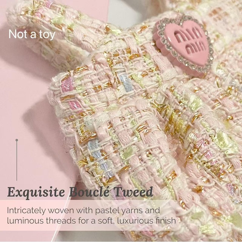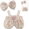 - Charming Bouclé Sparkle Features pastel tweed overalls with a faux rhinestone heart and a matching bow pin, adding sparkle and sweetness to any plush doll display outfit for adult collectors.