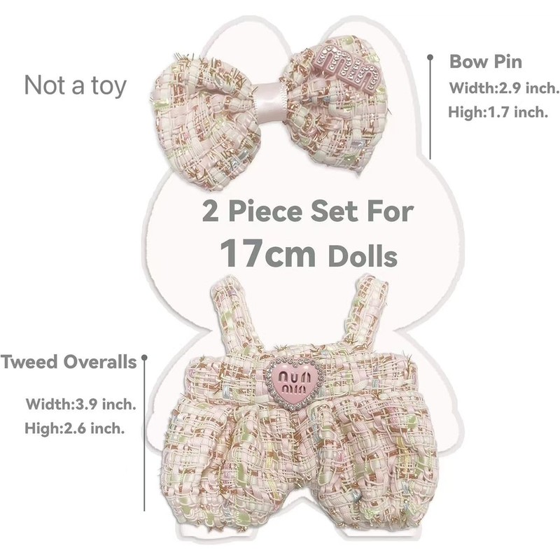 17cm Doll Clothes – Pink Tweed Overalls with Heart Patch & Bow Pin | Display-Ready Collectible Outfit for Mini Plush Dolls (No Doll Included)