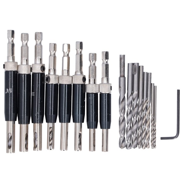 1、High Quality Material: It is made of high quality high speed steel to ensure high hardness, durability and excellent drilling performance. 2、Automatic Positioning: With automatic center positioning function, will not move, improve the accuracy and efficiency of the work, easy to use. 3、Dual Face Hole: Dual face hole design, can quickly and automatically discharge the sawdust in the holes on both sides, will not make the drill bit stuck. 4、Widely Applicable: Suitable for hinges, handles, drawer guides, woodworking, etc, suitable for professionals and DIY enthusiasts. 5、Complete Kit: A complete set of drilling kits, hinge drills in 8 different sizes, 1 hex wrench and 8 replacement drill bits to meet your needs.