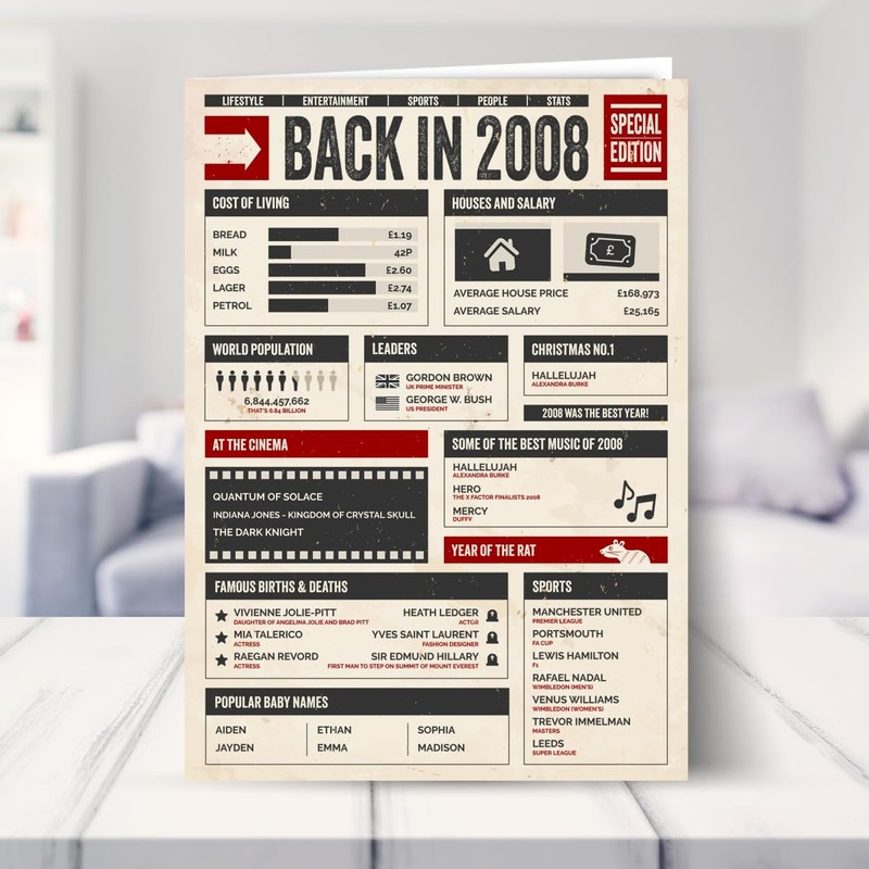 - Unique Nostalgia: A 17th birthday card for men and women that will take you on a journey back to 2008. With fun facts that remind them of their birth year.