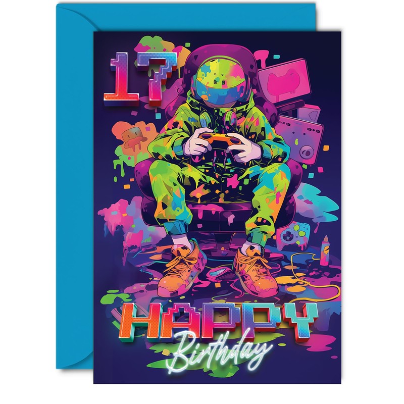17th Birthday Cards for Girls Boys - Video Gamer Game - Happy 17 Birthday Card for Son Daughter Nephew Niece Grandson, 5x7 Inch Seventeen Seventeenth Bday Greeting Cards