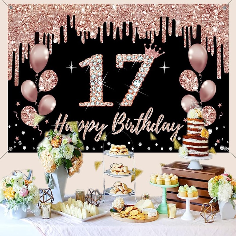 17th Birthday Decorations for Girls, Party Decoration Black and Rose Gold, 17th Birthday Fabric Sign Hanging Poster, 17th Birthday Backdrop Banner Party Welcome Sign