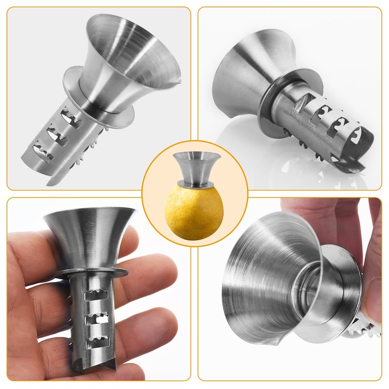 - INNOVATIVE DESIGN - Sharp blades on the lemon juicer penetrate citrus rind and bore quickly into the center of fruit to extract maximum amount of juice with minimal effort. Never any need to slice your citrus fruits, leaves the peel completely intact. Perforated insert ensures pulp and seeds are collected. The Stainless Steel Lemon Juicer Squeezer adopt a trumpet shaped pouring spout. In this way, the juice will flow perfectly into your cup.