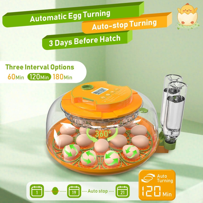 - Automatic Egg Turning: The incubator is designed with an automatic egg turning mode, which can be set to flip eggs every 60/120/180 mins, mimicking the natural hatching process. Also, the chicken incubators will automatic stop turning 4 days before hatch eggs to avoid excess turning to enhance the hatching rate.