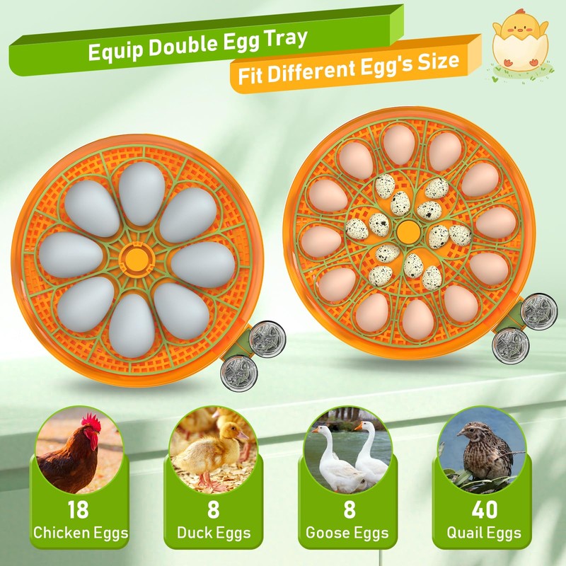 - Versatile Egg Hatching: This egg incubator has various functions and comes with 2 egg trays (18 egg trays and 8 duck egg trays), whether it is for home use, laboratory environment or classroom, this egg incubator can meet your needs. It is very suitable for hatching eggs, duck eggs, quail eggs, goose eggs, etc.