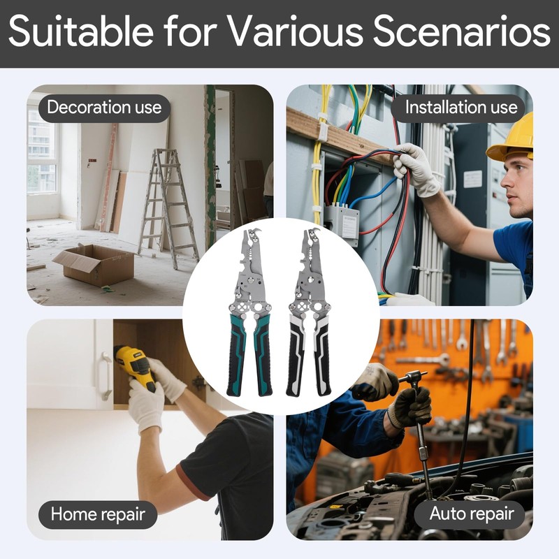 The wire stripper crimper is perfect for electricians, automotive technicians, DIY hobbyists, and home users working with wires, cables, and electrical components in various settings—homes, workshops, and garages.