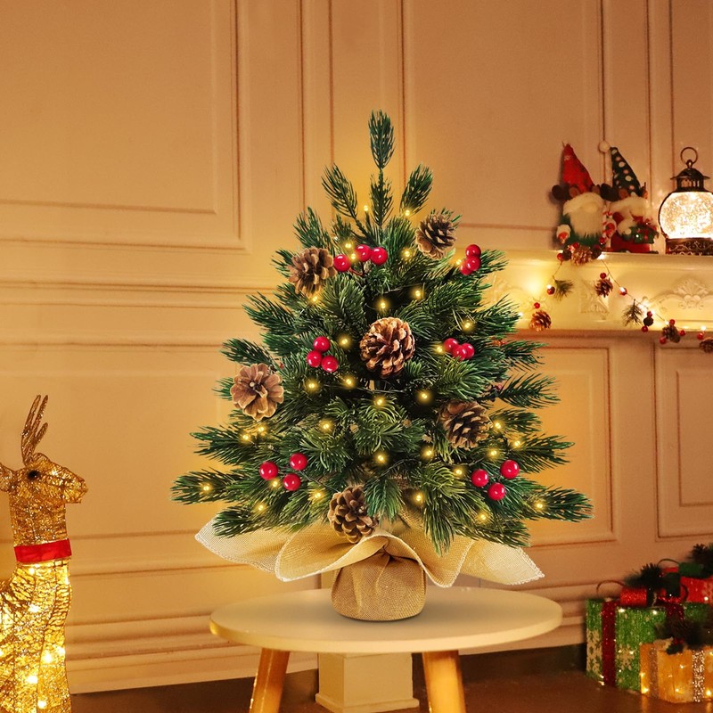 18 Inch 50 LED Thick Tabletop Prelit Christmas Tree Realistic Feel Lights with Timer Battery Operated 18 Red Berries 6 Pine Cone Artificial Xmas Spruce Tree Christmas Decorations Indoor Home Party
