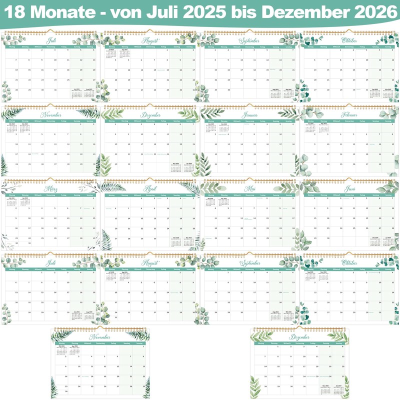 - 18-month wall calendar: Our calendar offers monthly overview from July 2025 to December 2026, a total of 18 months, with one page per month. Holidays are marked on the calendar, and on each monthly page you can also see thumbnails of the previous and next month's calendar, so you can get a more comprehensive overview of the dates.