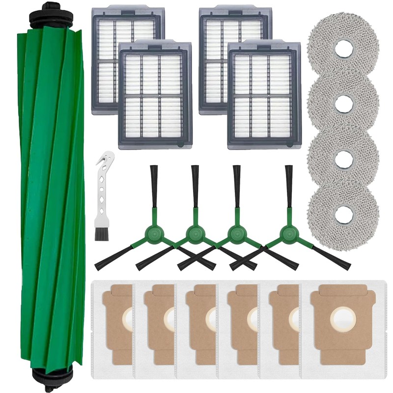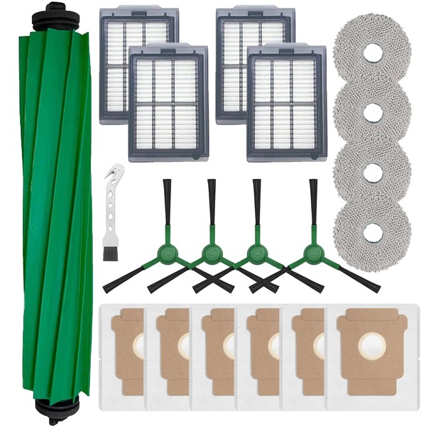 18 Pcs Replacement Part Kit for iRobot Roomba Plus 405 Combo/ 505 Combo Robot Vacuum, 1 Rubber Brush 4 Mop Cloth 6 Dust Bag 4 Filter 4 Side Brushes