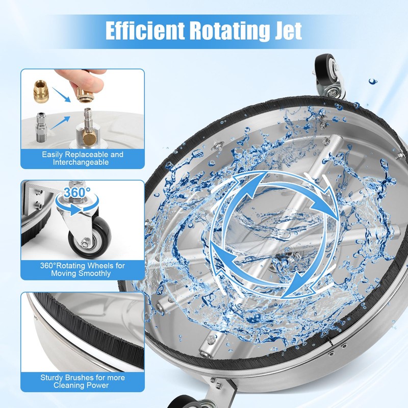 • Strong Construction:Crafted from high-quality, corrosion-resistant stainless steel, this pressure washer surface cleaner is built to last. Its heavy-duty construction not only guarantees extreme durability but also enables smooth operation. The bristle splash skirt is engineered to concentrate water power, delivering a more powerful clean while effectively minimizing overspray, making it ideal for both residential and commercial use