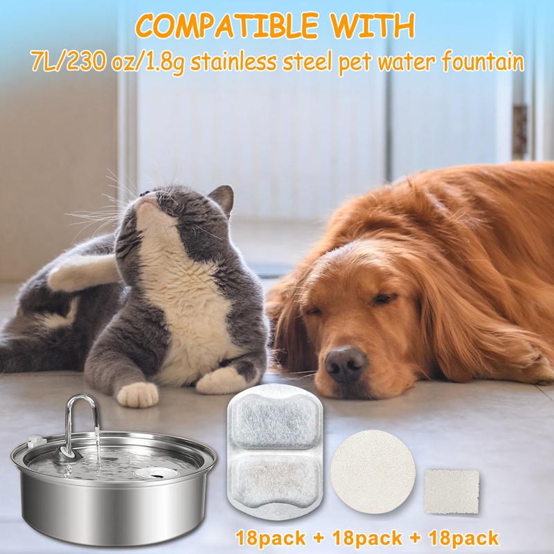 - 【Compatible with oneisall 7L Pet Water Fountain】The replacement filters and sponges are compatible with oneisall 7L/230oz/1.8G stainless steel dog water fountain , the package includes 18 pack pre-filter sponges, 18 pack activated carbon filters and 18 pack cotton filters.