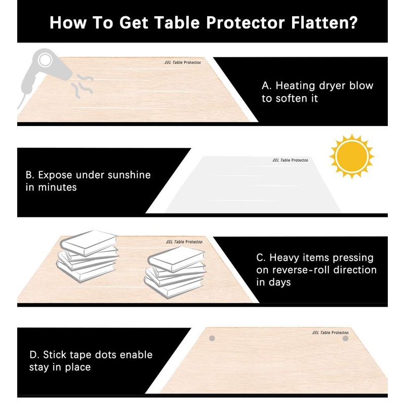 - 【TIPS TO MAKE IT FLATTEN】 Our table protector shipped in rolled package to saving your shipping cost. Here tips to make table protector flat in cold days: 1. Heating dryer blow or expose table protector under sunshine in minutes; 2. Put heavy items pressing on reverse-roll direction on table protector in days; 3. Use accessory tape dopts to fix table protector in place; 4. If need to trim it to fit, use pencil to mark the exact size first, cut is with a sharp blade or scissors.