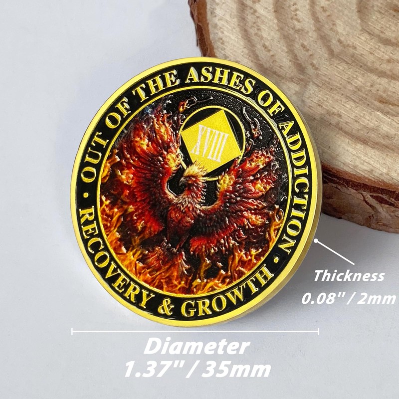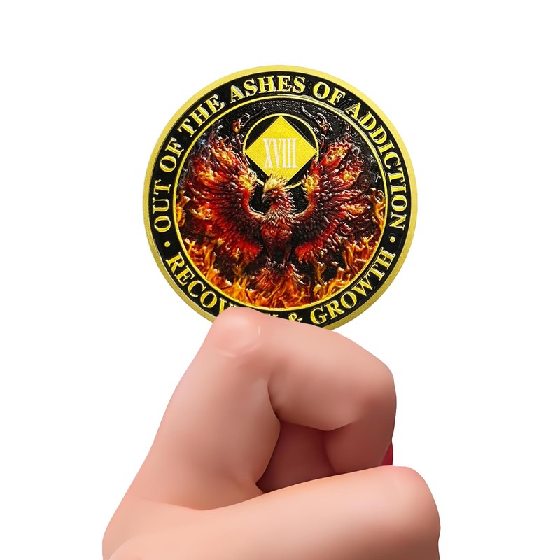 - 🌄Premium Craftsmanship: This 18 Year NA Medallion featuring a Fiery Phoenix is more than just a token; it's a symbol of strength and hope for those overcoming addiction. Crafted with meticulous attention to detail, this NA Recovery Coin features a striking 3D texture, offering a satisfying tactile experience. Made with quality materials, it’s the ideal commemorative coin for celebrating clean time.