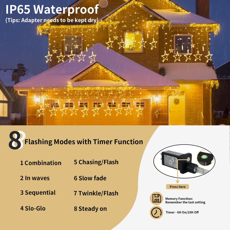 - 【8 Flashing Modes & Memory Function】Led curtain lights indoor features 8 flashing modes (Combination, In Wave, Sequential, Slo Glo, Chasing/Flash, Slow Fade, Twinkle/Flash, Steady On). The memory function keeps the previous light mode on the next time it is turned on.