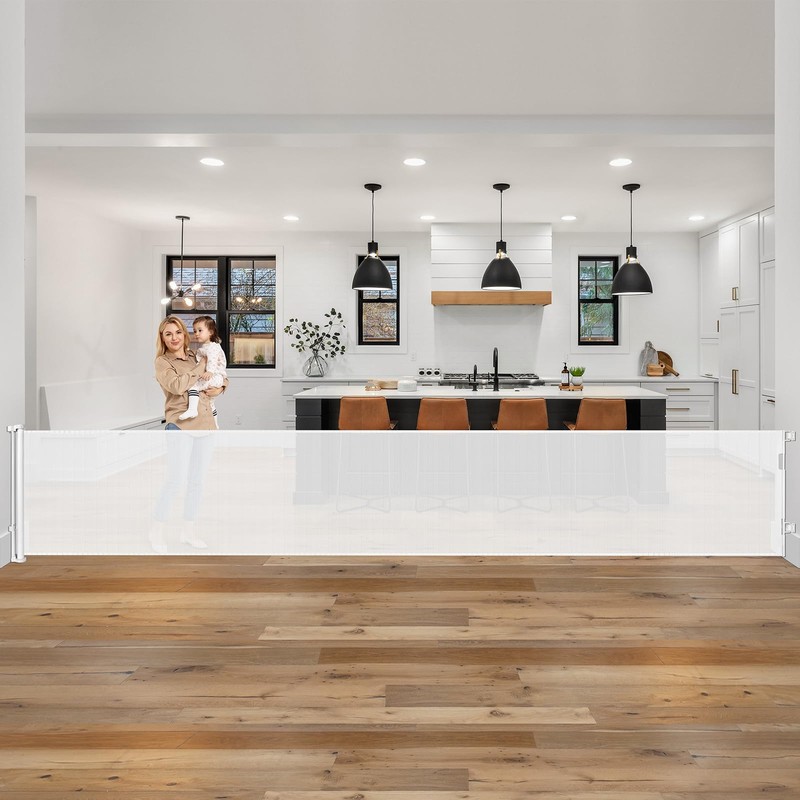 The KISKIZ extra long retractable baby gate functions as a child safety gate, pet barrier, semi-enclosed play area, fireplace guard, and room divider. It offers flexible solutions for homes with open floor plans or wide spaces, allowing you to effectively manage and divide areas for both babies and pets.