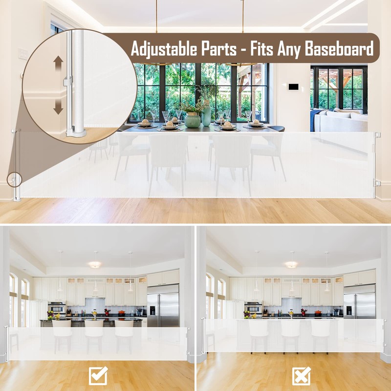 - 185-inch Extra-Wide Coverage: This retractable baby gate extends up to 185 inches, making it perfect for securing large indoor and outdoor openings. Whether it's doorways, hallways, garages, decks, or more, this retractable fence works effectively as both a barrier and room divider.