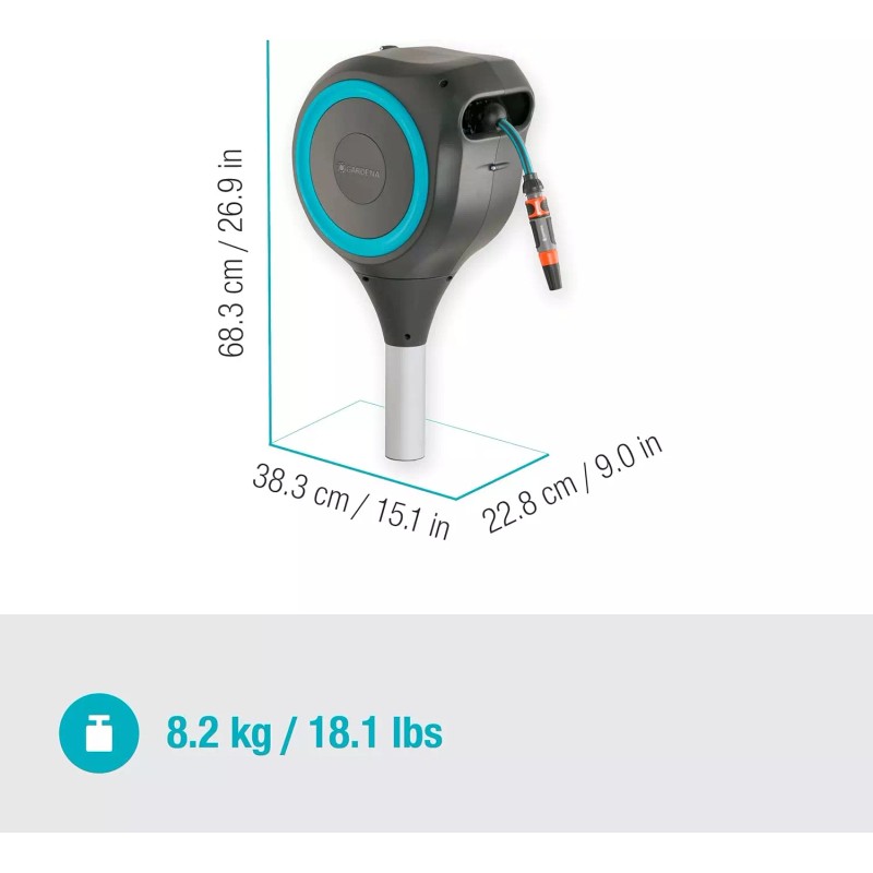 - Items delivered: 1x GARDENA Retractable Hose Reel, GARDENA premium hose, Metal spike, mounting rod, 5 ft connecting hose, connection fittings and infinitely adjustable spray nozzle