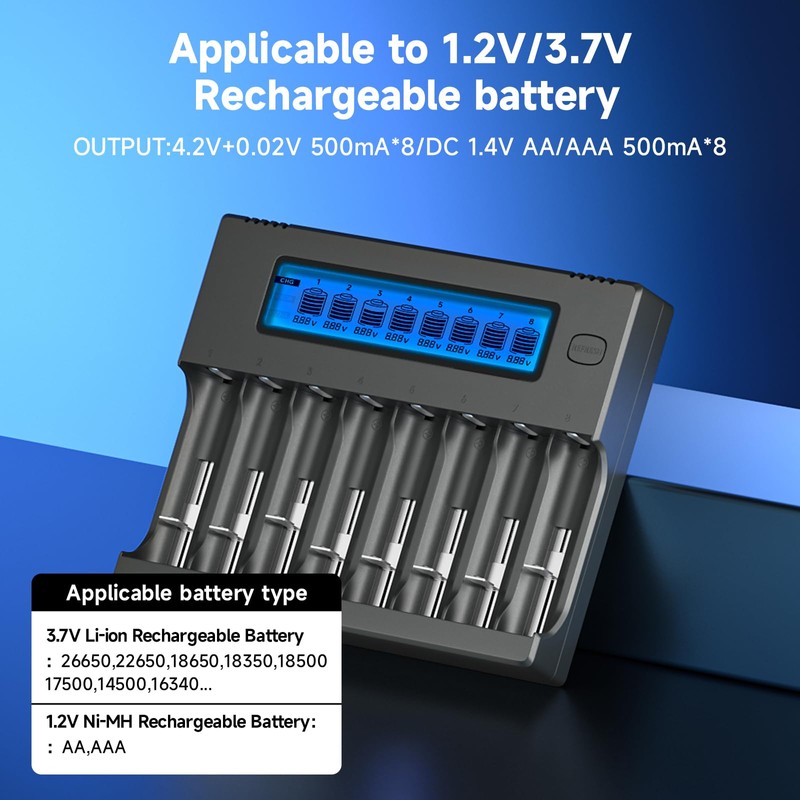 - 3.6V/3.7V Lithium ion Battery Charger: Li-ion/IMR/INR/ICR/LiFePO4 (3.6V-4.35V) batteries, such as 10440, 14500, 16340 (RCR123), 18650, 20700, 21700, 22650, 26650, and more, can be fully charged with this 8-bay multi-bay charger. Additionally compatible with Ni-MH/Ni-Cd (1.2V) in sizes AA, AAA, AAAA, C, and SC. (Please be aware that 1.5V lithium batteries are not compatible.)