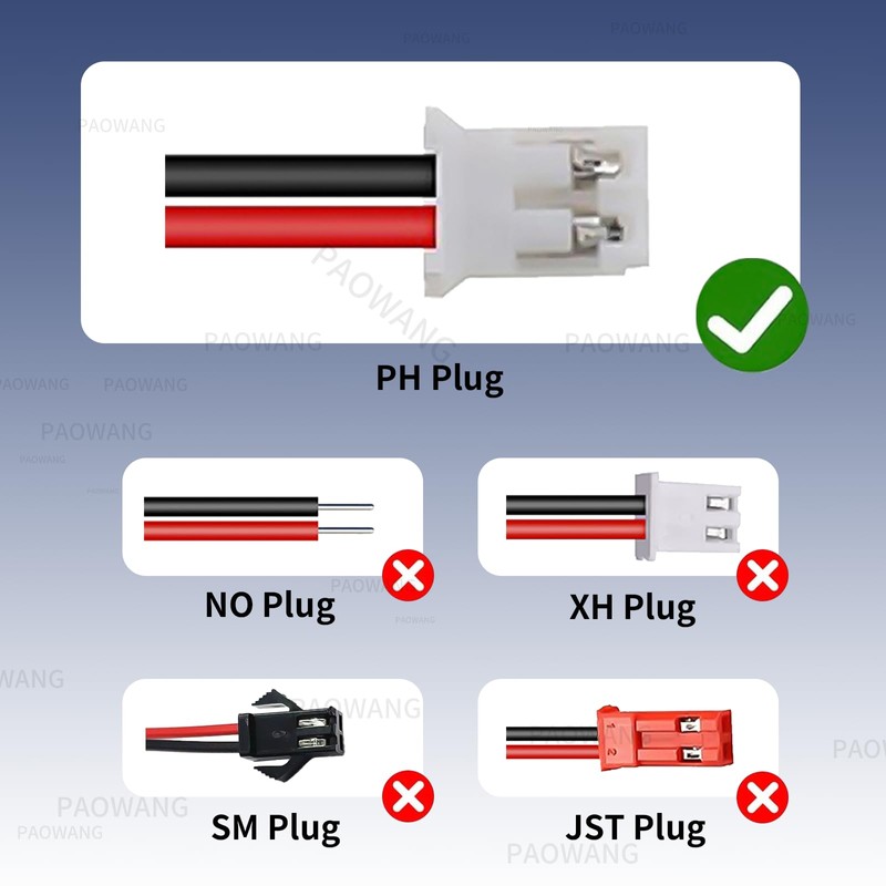 - Battery Plug Model:PH Connector-2 Pin, The red wire represents the positive terminal (+) and the black wire represents the negative terminal (-)