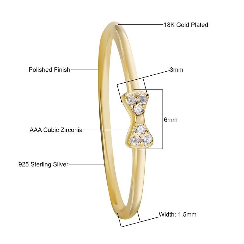 18K Gold Plated 925 Sterling Silver Pave Ribbon Bow Tie Knot Ring Stackable Wedding Engagement Band with Cubic Zirconia, Nickel Free Hypoallergenic for Sensitive Skin with Gift Box, Metal Gemstone,
