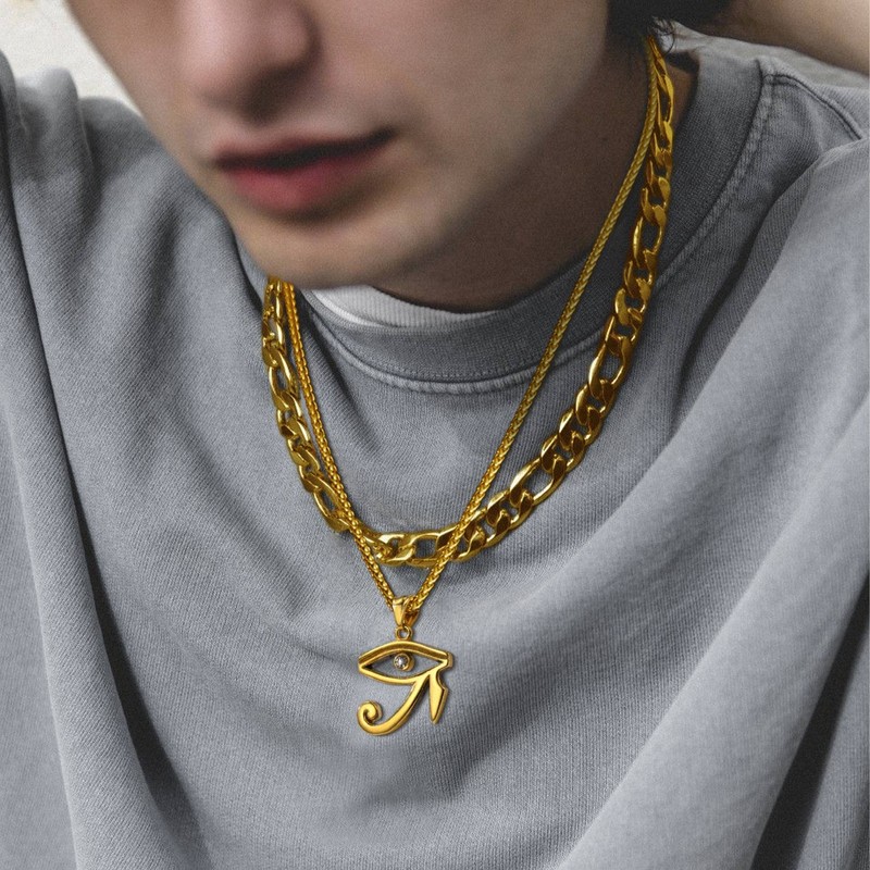 - MEASUREMENT: Pendant size 37mm*26mm, with 22" Stainless Steel Chain (2” extender ). Sturdy and durable. This Egyptian Udjat Eye of Horus Ra Pendant Necklace is available in three colorways; 18K Gold plated, 316L Stainless Steel and Black Platinum.