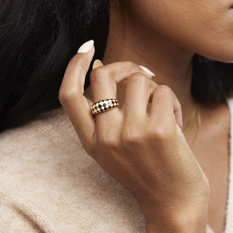 - A vintage-inspired checker printed dome ring. It will never go out of style. It creates a modern look with a touch of fun into your daily stack.