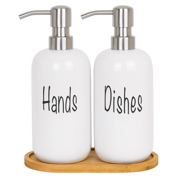 18oz Ceramic Soap Dispenser Set (2 Pack) with Stainless Steel Pump & Bamboo Tray, Bathroom & Kitchen