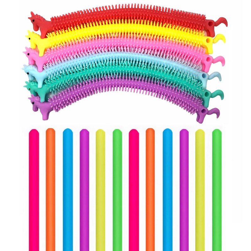 - DOUBLE SENSORY EXPERIENCES - 12pcs+6pcs excellent quality Fidget stretchy string contains two styles: 12pcs Classic Stretchy String and 6pcs Newly Designed Unicorn Stretchy String. Two different styles of stress relief ropes can give you different tactile experiences that can help reduce anxiety and irritability by stretching, twisting, and pulling, and release stress, Helps develop sensory and motor skills