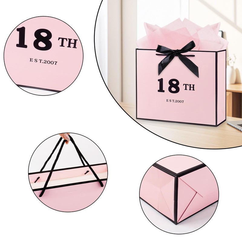 18th Birthday Gift Bag 12.6× 4.3× 10.6 Inches Large Birthday Gift Bag with Tissue Paper, 40th Birthday Bag for Women and Men(Pink)