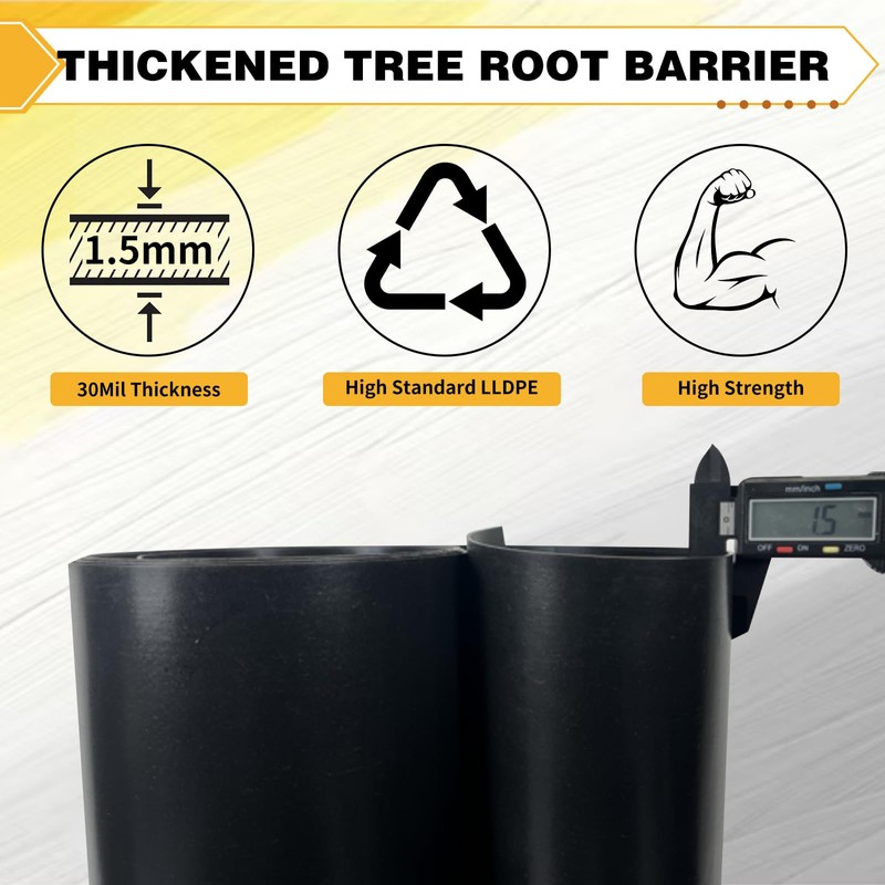 - 19.7INx20FT tree root barrier roll: The root barrier is made of high standard LLDPE material. The thickness is up to 30 mil/1.5mm, this appropriate thickness is easy to easy to cut with a utility knife & easy to work with, strong enough to control roots at the same time.