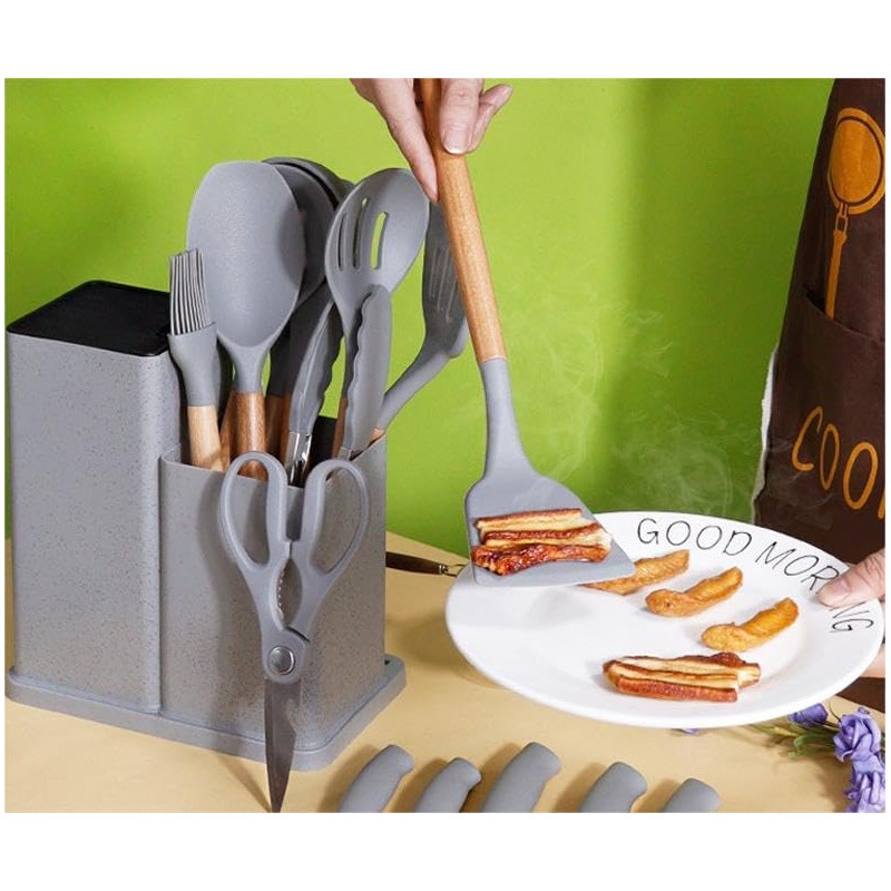 - 11 PIECE SILICONE KITCHEN UTENSIL: Cooking utensils set is made of highly durable silicone. Including Deep Soup Ladle. Serving Spoon. Slotted Spoon. Slotted Turner. Pasta Server. Flexible Spatula. Basting Brush. Whisk. Tongs. Round Spatula. Turner.