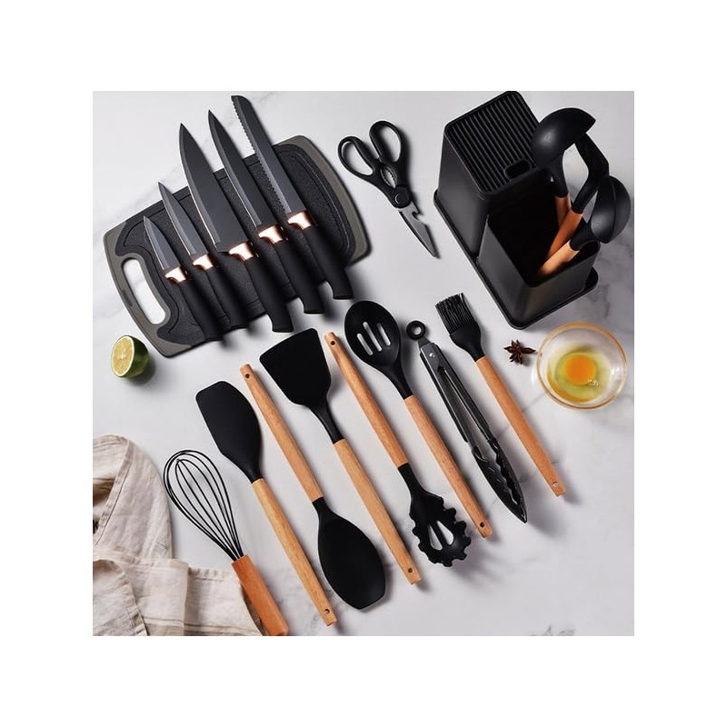 19 Pcs Silicone Kitchen Cooking Utensils Knife Set Cutting Board Sharp Scissors Chef Knife Set with Holder (Black)