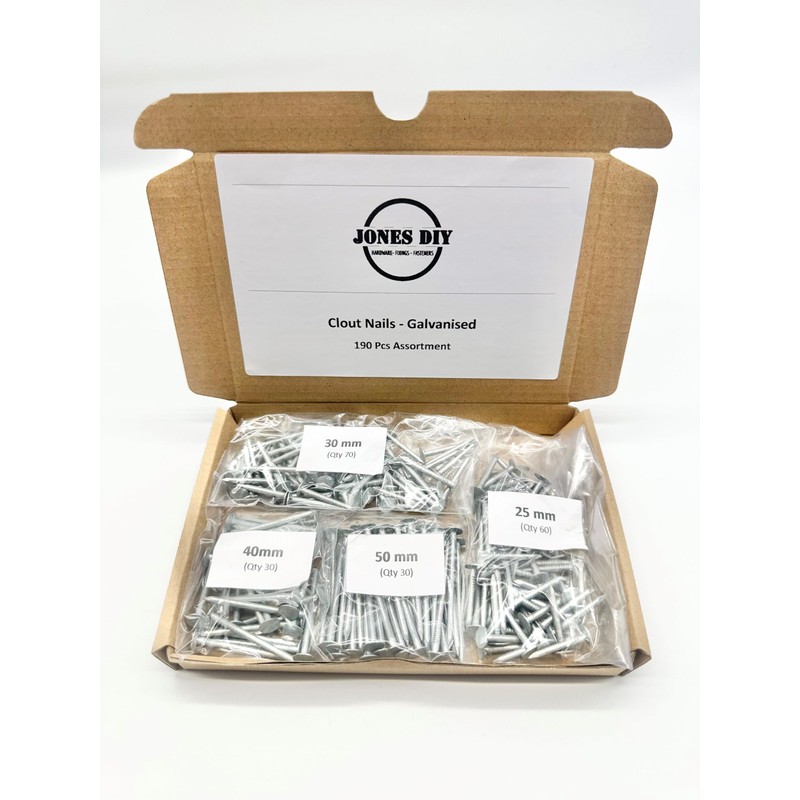 190 pc Premium Galvanised Clout Nail Assortment Postal Box (25mm, 30mm, 40mm and 50mm)