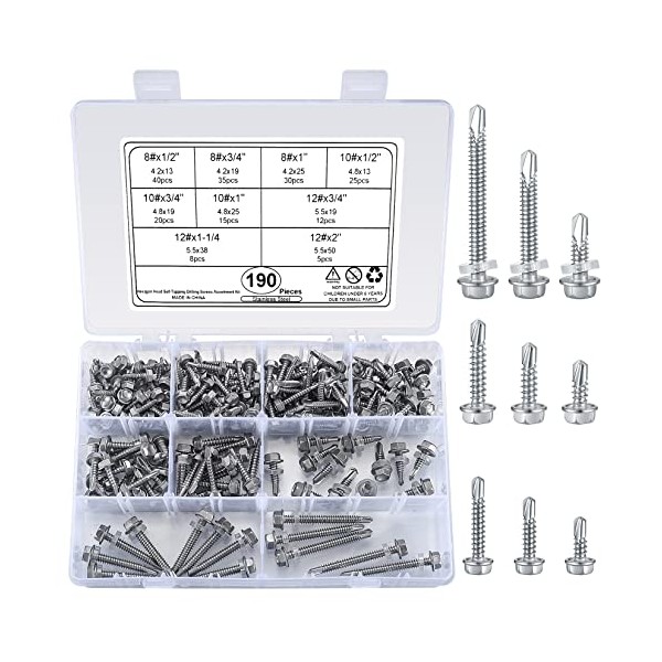 190 Pcs Self Drilling Screws with Hex Washer Head, M4.2/M4.8/M5.5 410 Stainless Steel Sheet Metal Tek Screws Assortment Kit, Self Tapping Roof Wood Construction Building Self Drilling Screw Set