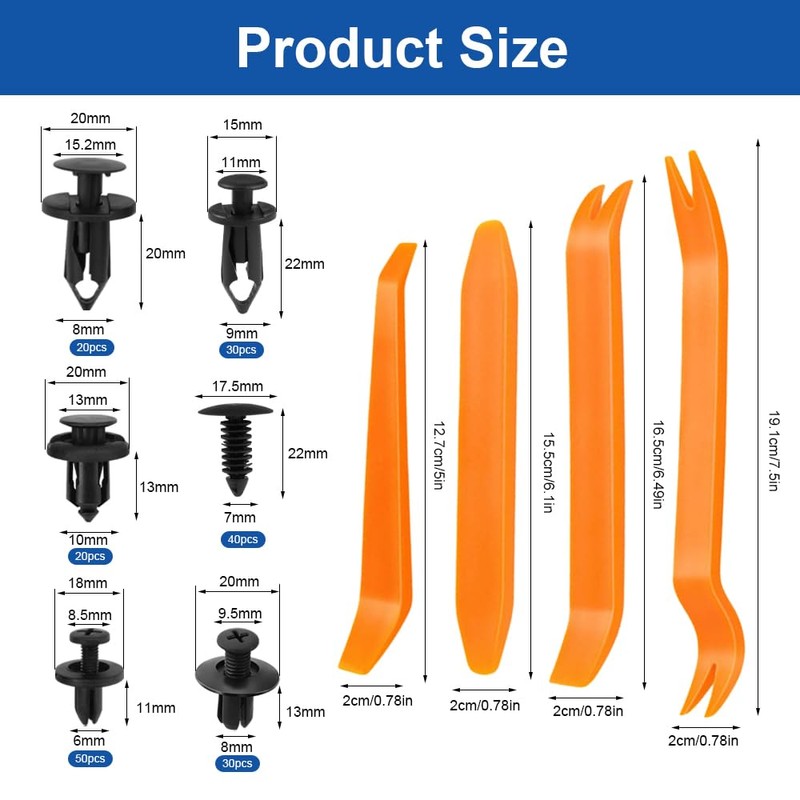 1. Enthält 190 kfz clips und 5 Demontagewerkzeuge. Die Klemmen sind in 6 Größen mit Lochdurchmessern von 6 mm bis 10 mm erhältlich und für die meisten Fahrzeuge geeignet.