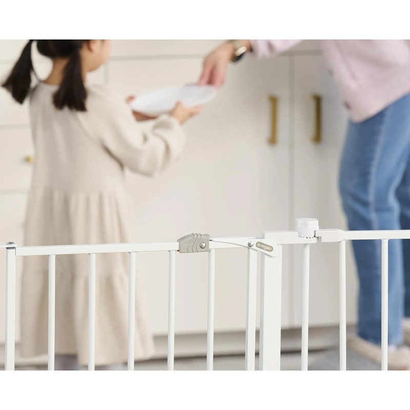 SAFETY: Designed with a walk-through door with safety locking feature. Wall mounted for added security and protection. Meets all current safety standards. For children up to 24 months and great for pets too
