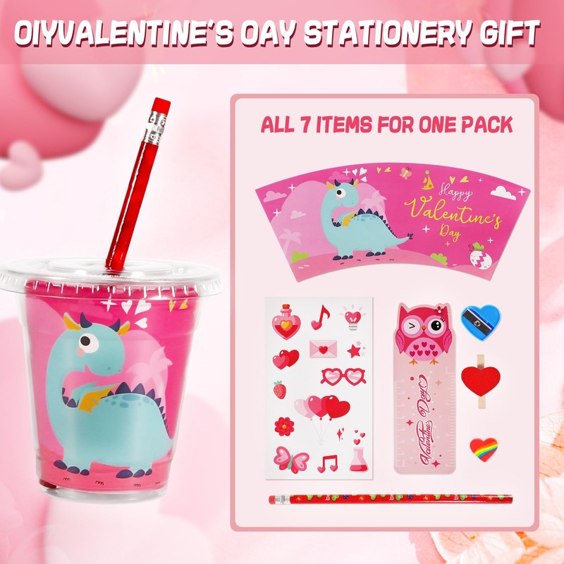 - Excellent Kids Valentines Day Gifts Set: Super Value Valentine’s Stationery Gift Set includes 24 cups, 24 cards (4 designs), 24 pencils, 24 erasers(3 designs), 24 Heart-shaped pencil sharpener(3 colors), 24 stickers, 24 rulers(6 designs), 24 Love Wooden Clip(5 colors). Total of 192 pieces