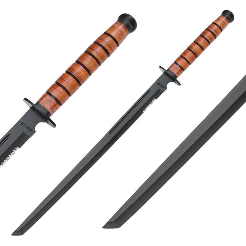 - As tribute to the original, “US 1942” is etched on the sword’s 19 3/4" black coated AUS-6 stainless steel blade.