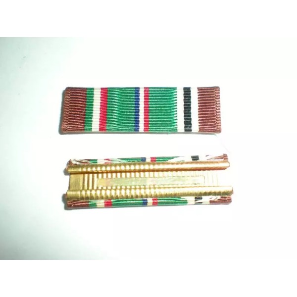 1950'S WWII EUROPEAN-AFRICAN-MIDDLE EASTERN CAMPAIGN MEDAL RIBBON -CRIMPED BACK. IN NEW AND UNISSUED CONDITION. PLEASE NOTE: MAY SHOW AGING. 1 (ONE) RIBBON. GETTING HARD TO FIND.