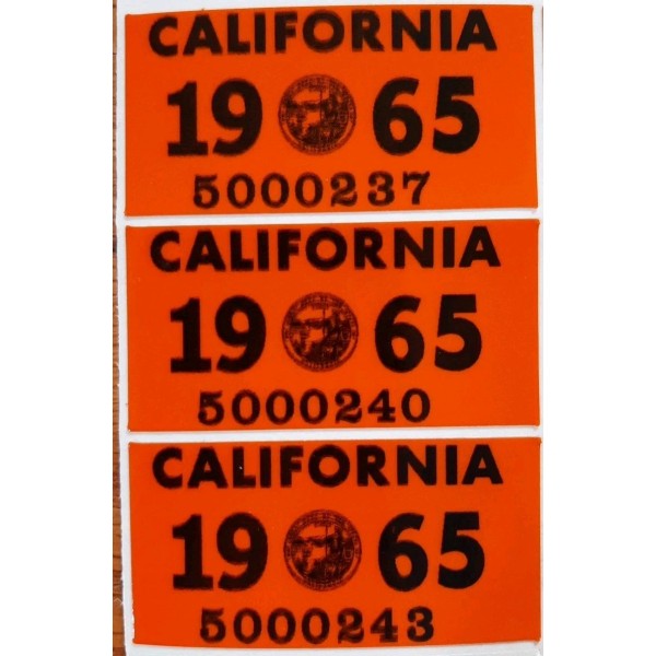 One 1965 YOM California license plate sticker, Dmv, Ca, Registration. $12.00 EACH. again, this is for 1 sticker, not the whole sheet.