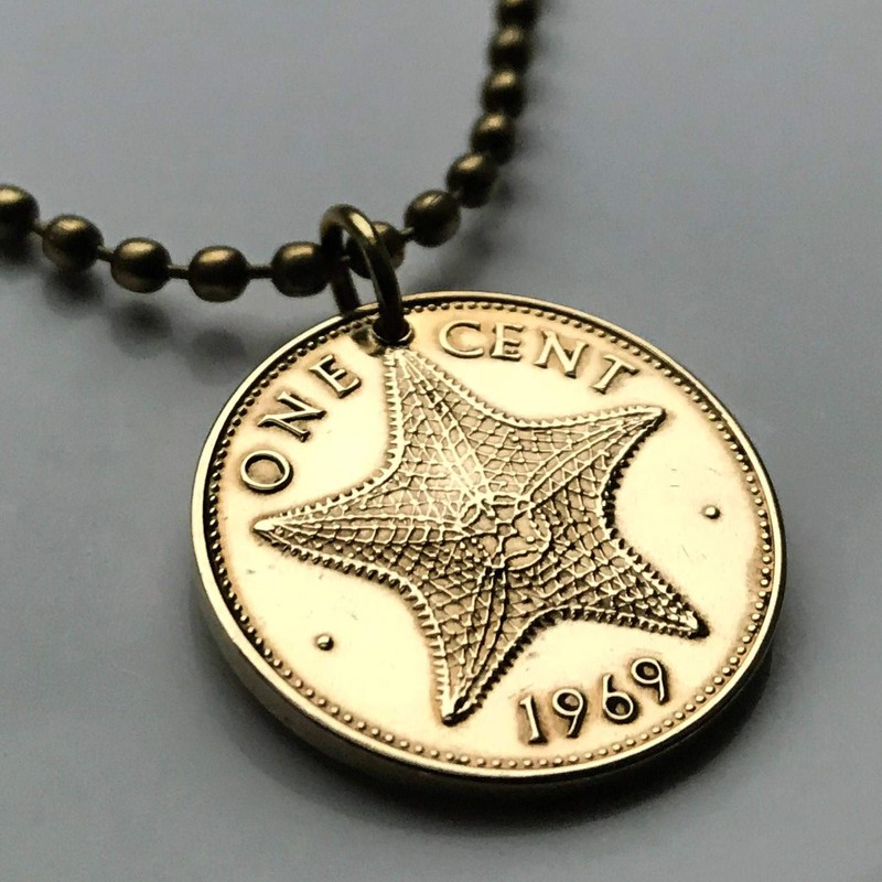 1966 Bahamas Cent coin pendant Bahamian starfish sea star Nassau Andros Exuma Junkanoo Rose Island Lighthouse Beach Rum Cay sand sea Paradise Island Cabbage Beach Junkanoo Blue Lagoon n000035