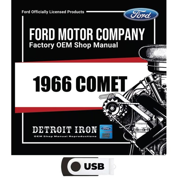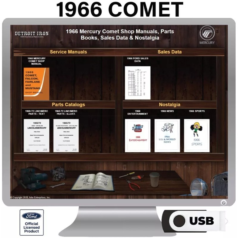 The 1966 Mercury Comet Shop Manuals, Sales Data & Parts Books on USB is a digital product published by Detroit Iron and licensed by Ford. This Detroit Iron digital product provides a full set of original equipment manufacturer (OEM) repair and rebuild literature in digital / PDF format. This set of manuals and literature were originally authored and published by the car / truck manufacturer to be used by their dealership mechanics so they are very comprehensive. It features an easy-to-use bookcase in a garage scene containing a seto of PDF manuals, catalogs, brochures and nostalgia for a specific year, make and model range.
