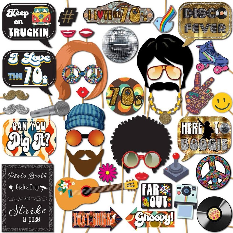 - Props make great 70s party decorations; Cutouts make perfect wall backdrops, table decorations, birthday decor, cake toppers, photo shoot props, hippie decorations, or 1970's decor; Add to scrapbooks, photo albums, or send your guests home with their favorite design as a party favor